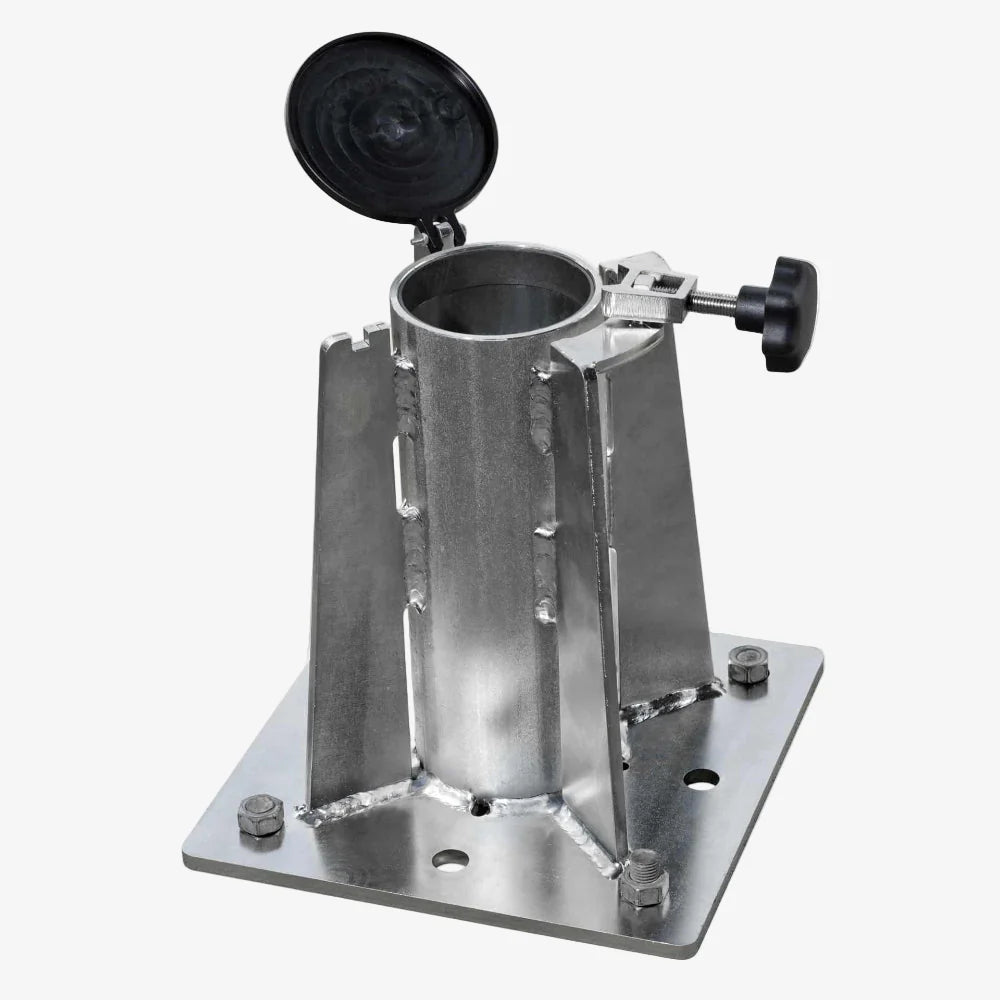 Ocynkowana stopa montażowa do żurawia GEBUWIN SD900, o udźwigu 900/600 kg, przeznaczona do montażu na betonowej podłodze. Stopa jest przygotowana do mocowania do podłoża przy użyciu 4 (8) śrub. Wyposażona jest w śrubowy mechanizm blokady słupa nośnego żurawia, który uniemożliwia obrót żurawia.